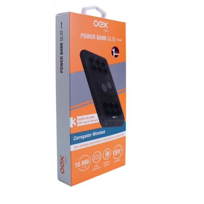 PB306 POWER BANK GLID PR OEX 15W WIRELESS REC. RAPIDA C/ VENTOSA USB, TYPE C BOTAO ON/OFF
